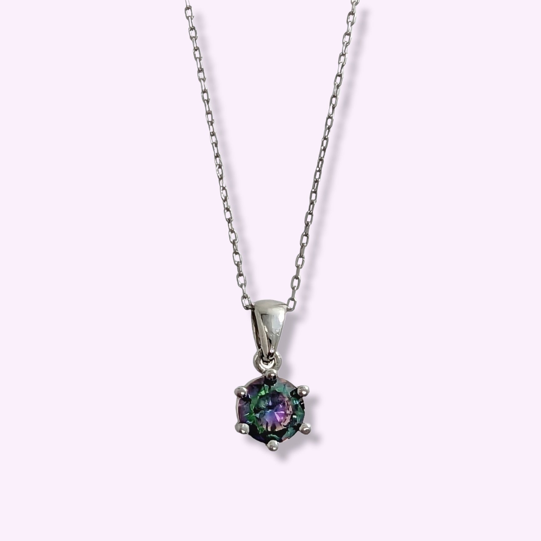 This Genuine 925 Sterling Silver Women's Necklace features a pendant in the round shape, adorned with Mystic Topaz. The Necklace is hallmarked 925 and nickel-free. The stylish pendant design is perfect for occasions such as Mother's Day, Christmas, graduation, anniversaries, birthdays and Valentine's Day. The Necklace is crafted with Sterling Silver and features a solitaire setting, making it a beautiful and elegant piece of fine jewellery that can be gifted to a loved one or worn as a personal statement.
