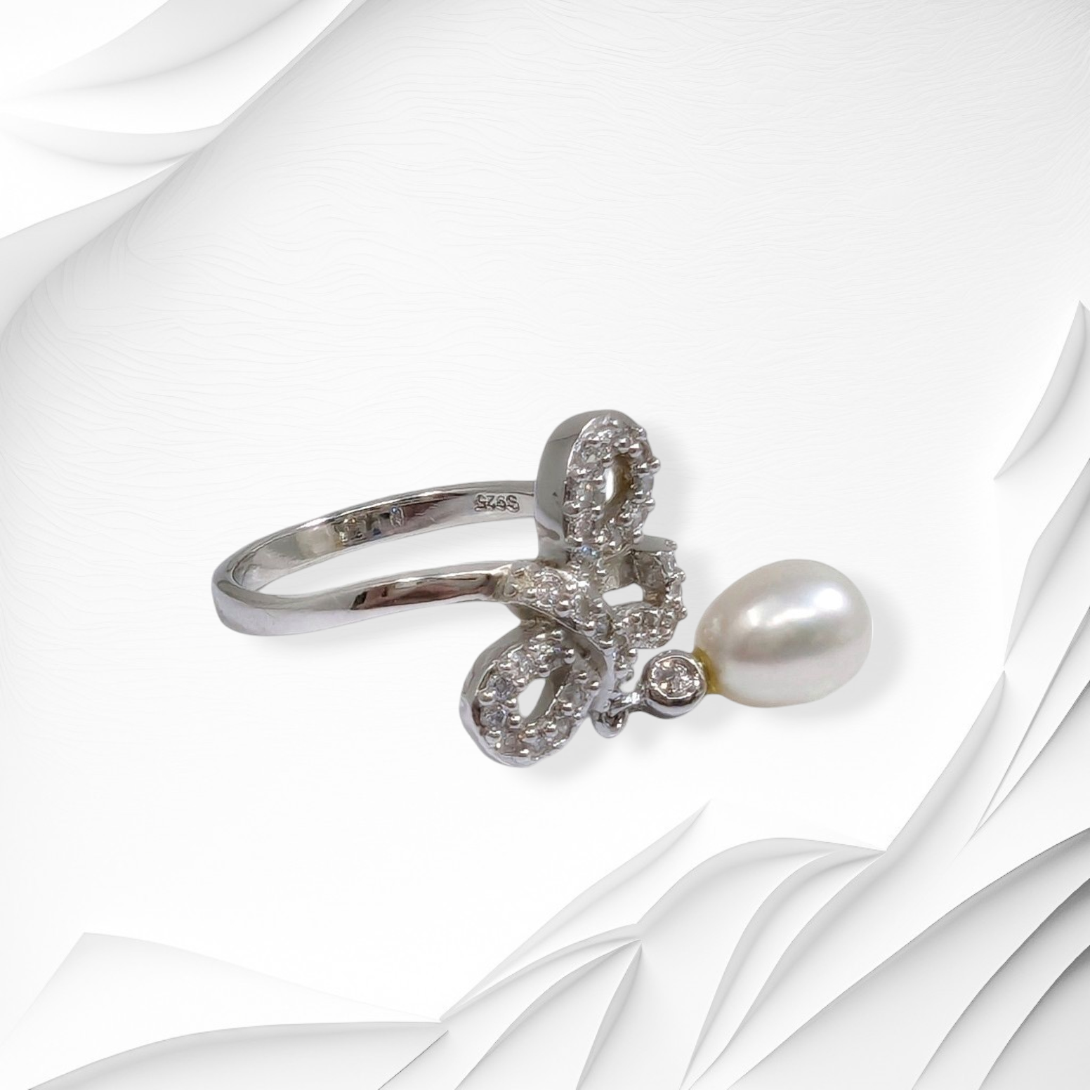 925 Sterling Silver Women's Ring with Authentic Freshwater Pearl and Cubic Zirconia Crystals